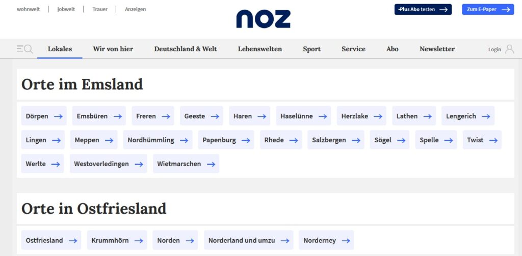 „Hinter NOZ/mh:n MEDIEN verbirgt sich mehr als regionaler Qualitätsjournalismus“, liest man auf der Internetseite https://noz-mhn.de/ueber-uns/ der Neuen Osnabrücker Zeitung. Die Regionalität hat das Osnabrücker Unternehmen mit der Rheiderland Zeitung, den DK Medien in Delmenhorst und einigen Blättern in Schleswig-Holstein deutlich ausgeweitet. Bei so vielen Regionen kann man leicht den Überblick verlieren und lokale geografische Details verwischen. So führt die NOZ die ostfriesische Gemeinde Westoverledingen bei den Orten im Emsland auf.
