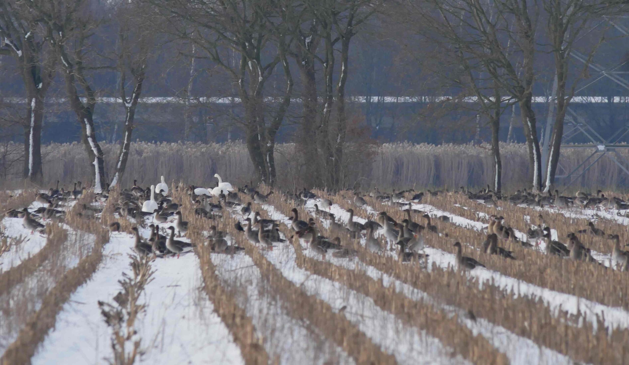 Gänse und Schwäne im Schnee auf Maisfeld (Bild: HM)